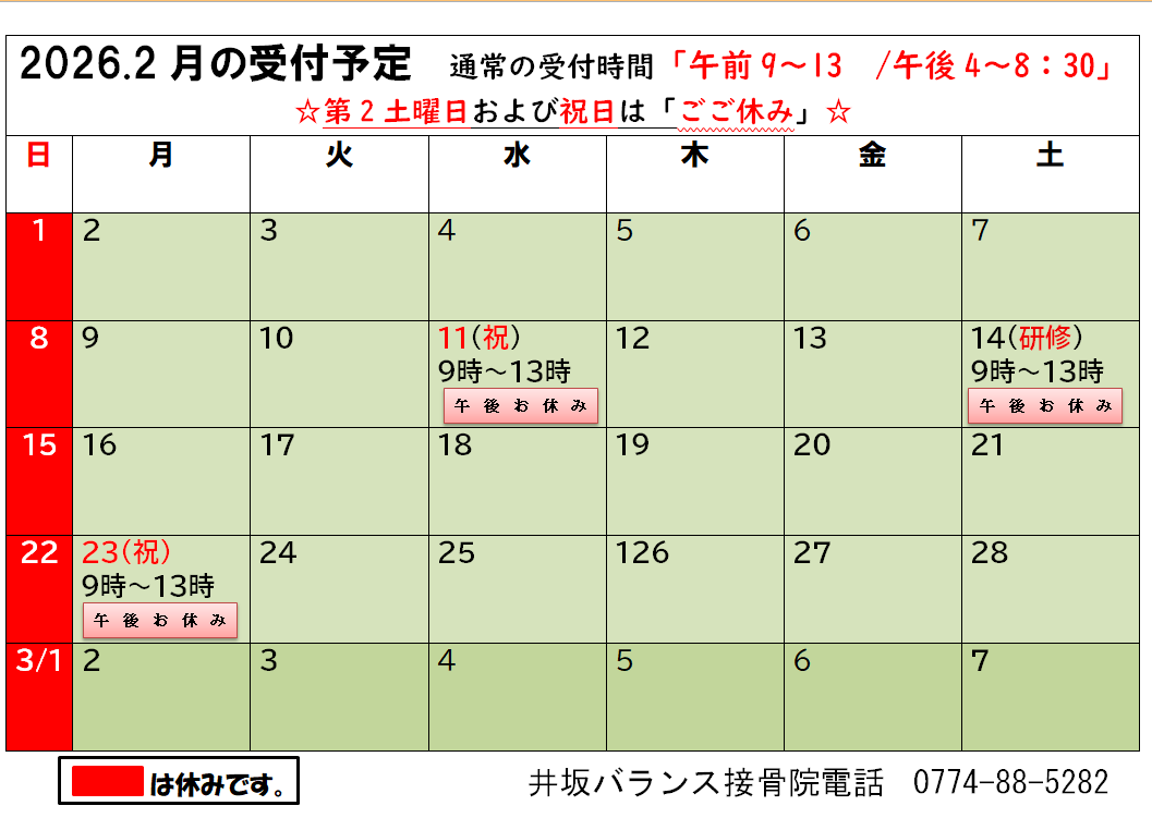井坂バランス接骨院の月ごとの診療予定を載せております。