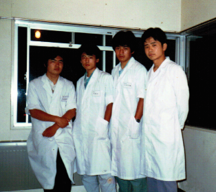 写真左端が私(↑夜23時頃大学の研究仲間と休憩時間。)